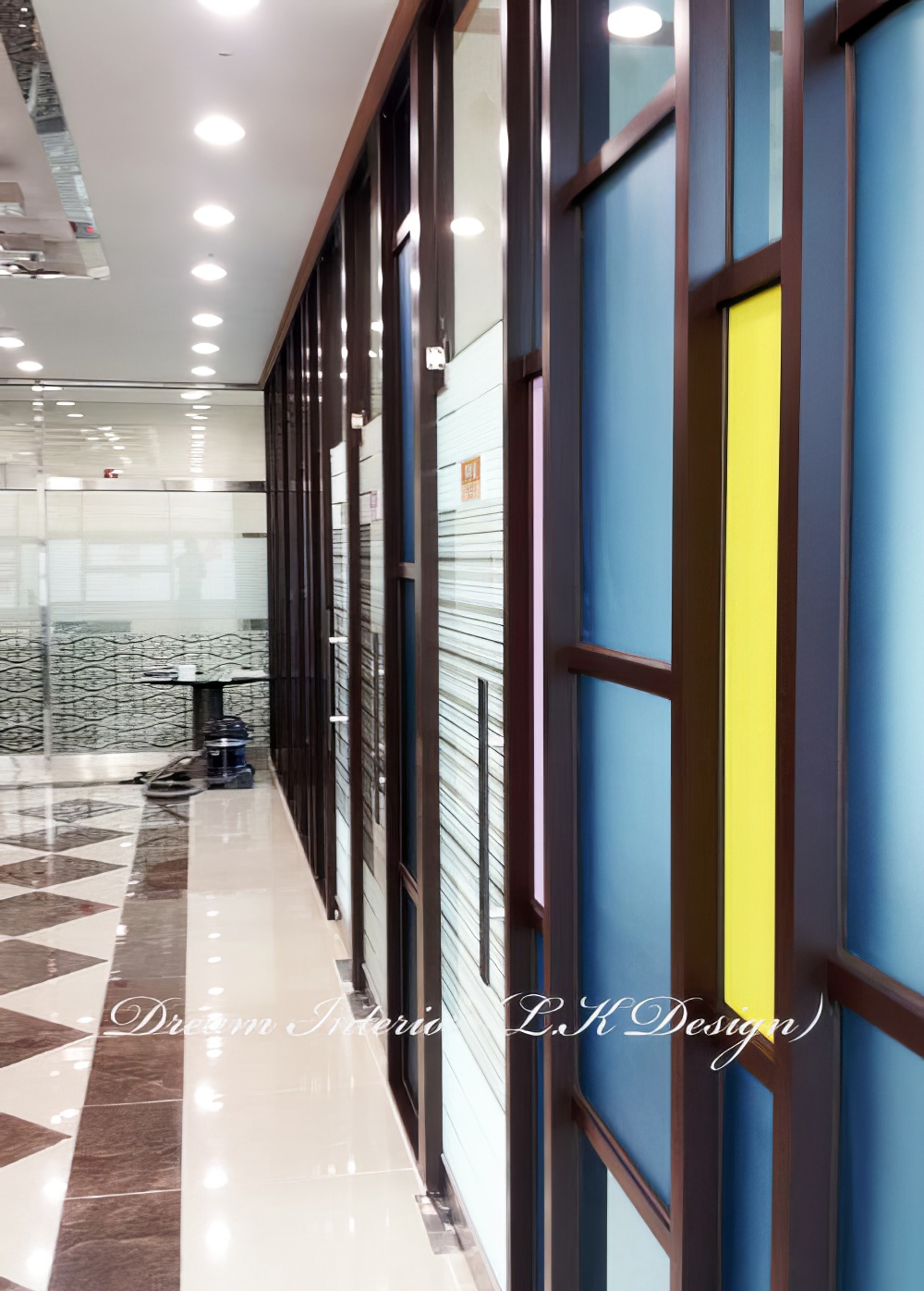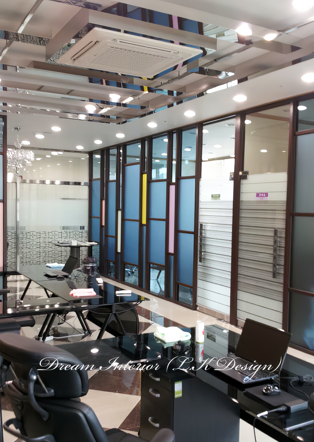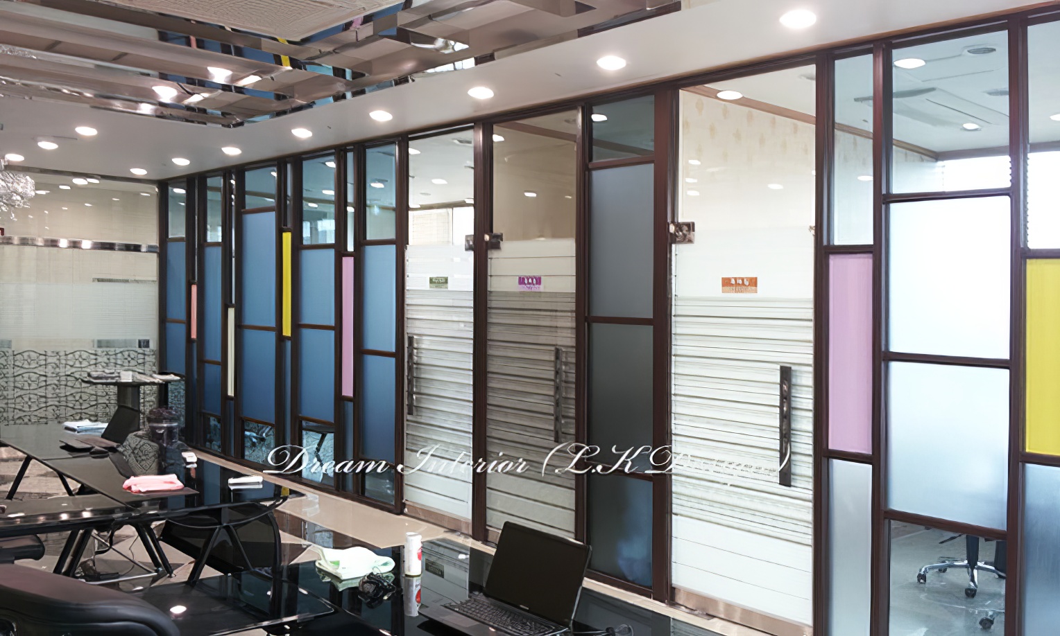파티션은 갈바 후레임으로 제작을 하여 컬러 유리 마감을 하였습니다.