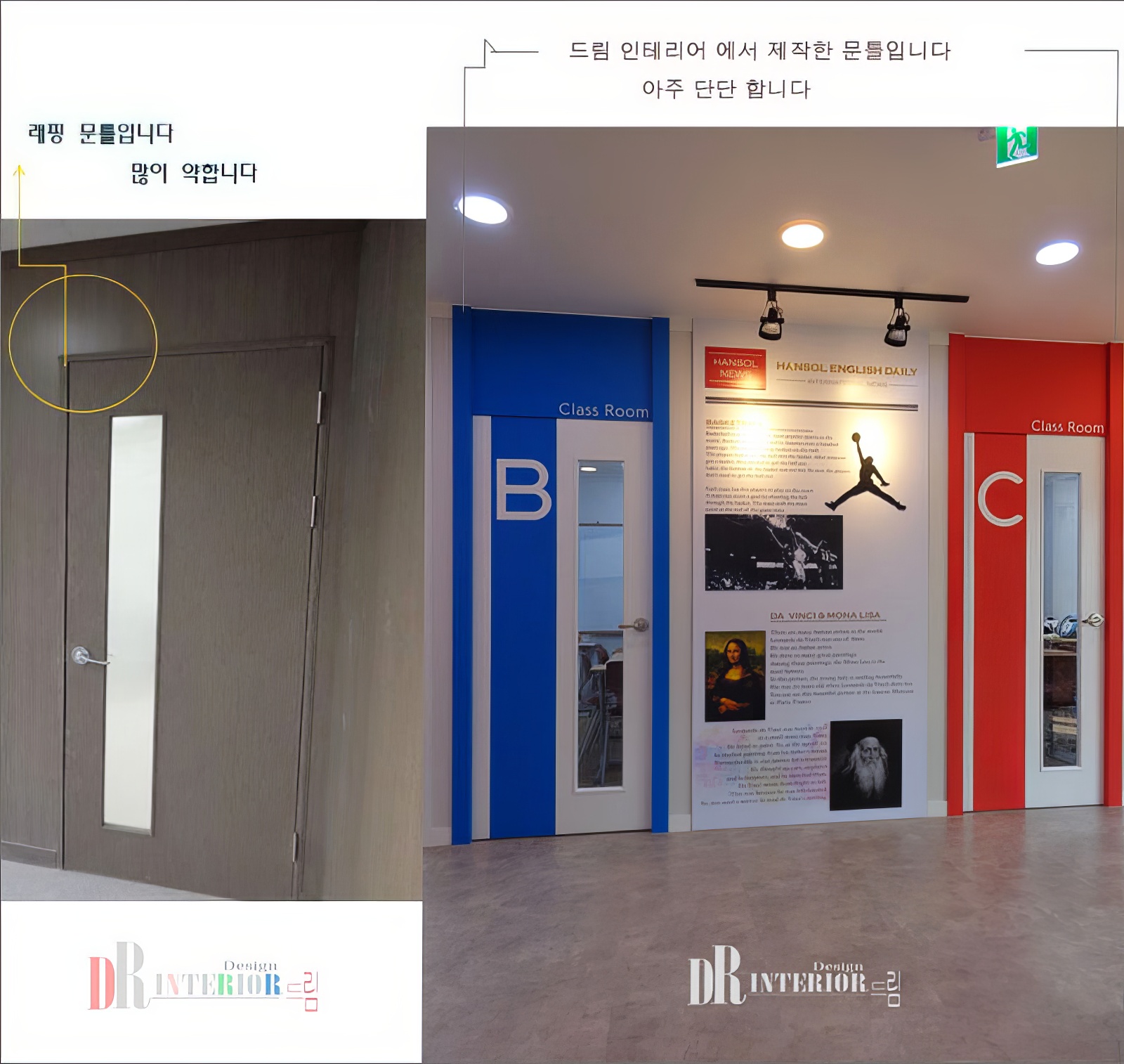 드림 디자인 에서는 래핑 판넬의 취약한 문틀을 사용하지 않고 직접 현장 제작하여 아주 단단한 문틀을 시공 합니다.