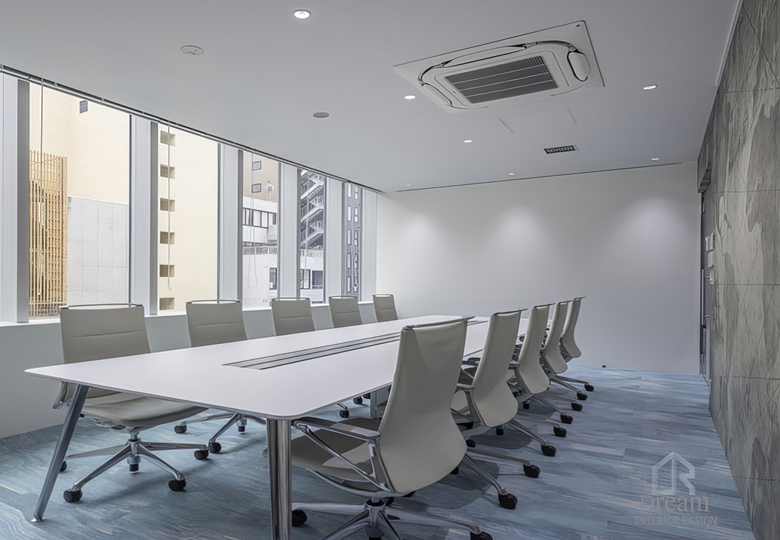 시원 스런 데코 타일 색상, 포인트 회벽 시공으로 마감을 한 색감을 살린 회의실 입니다.