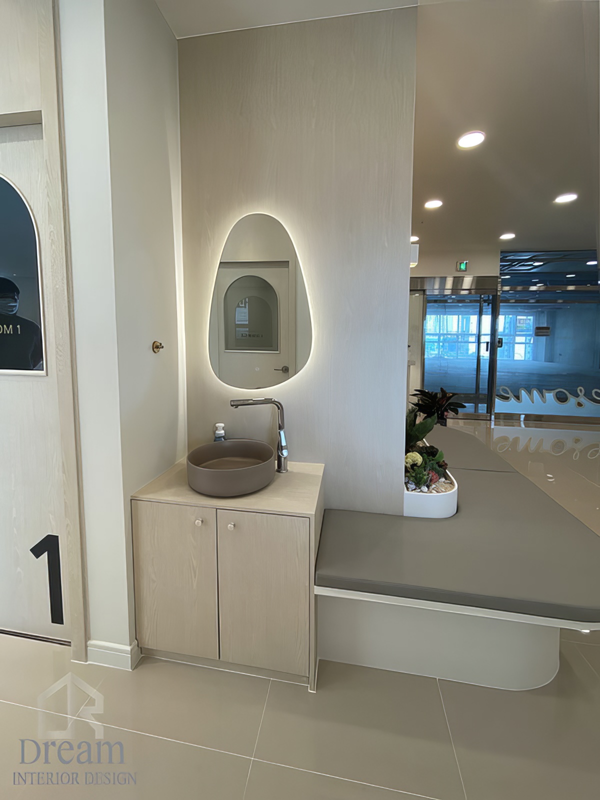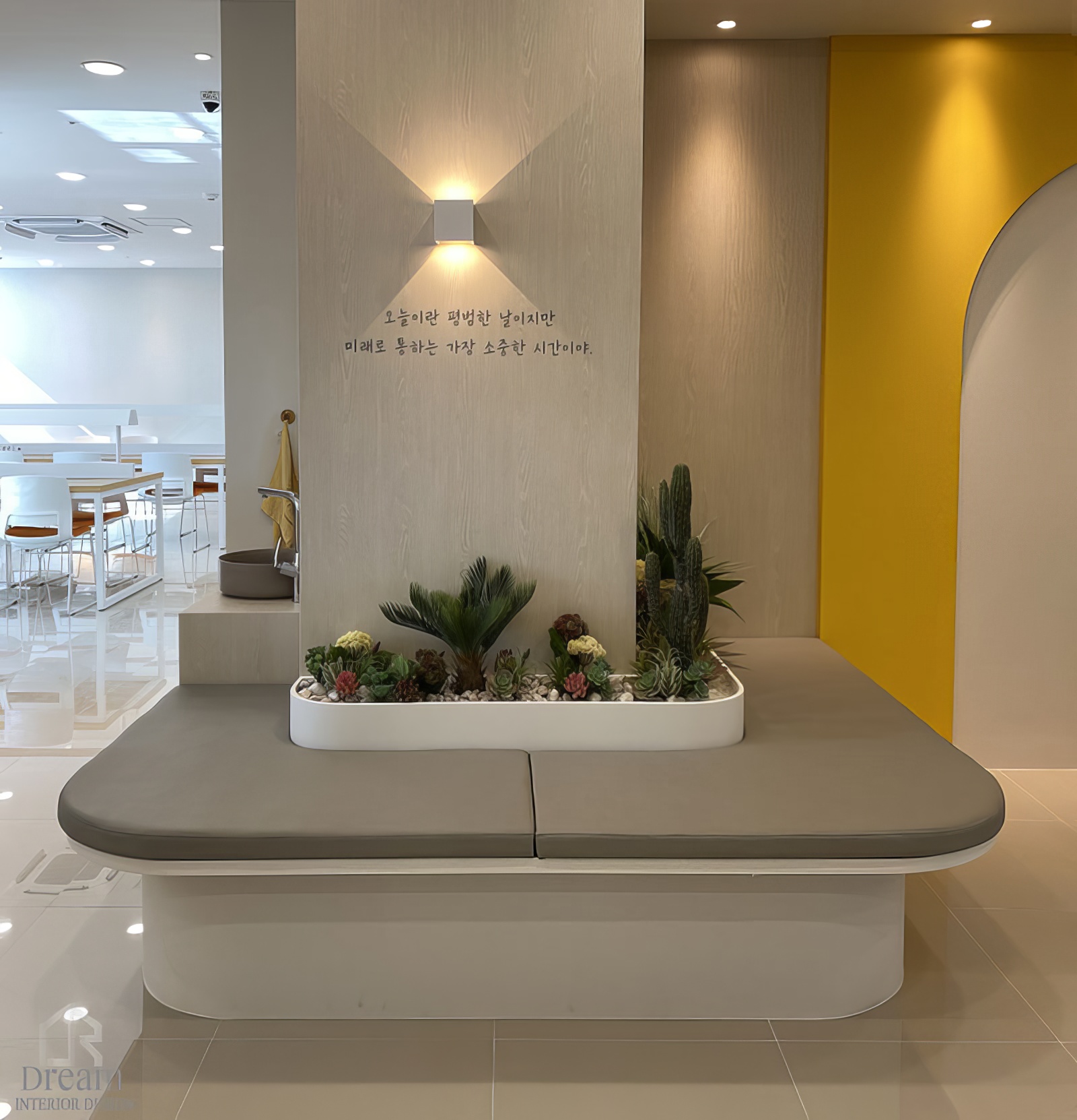 ▼중앙의 기둥을 이용하여 대기 쇼파를 만들면서 벽조명을 시공하고 화단을 조성 하였습니다