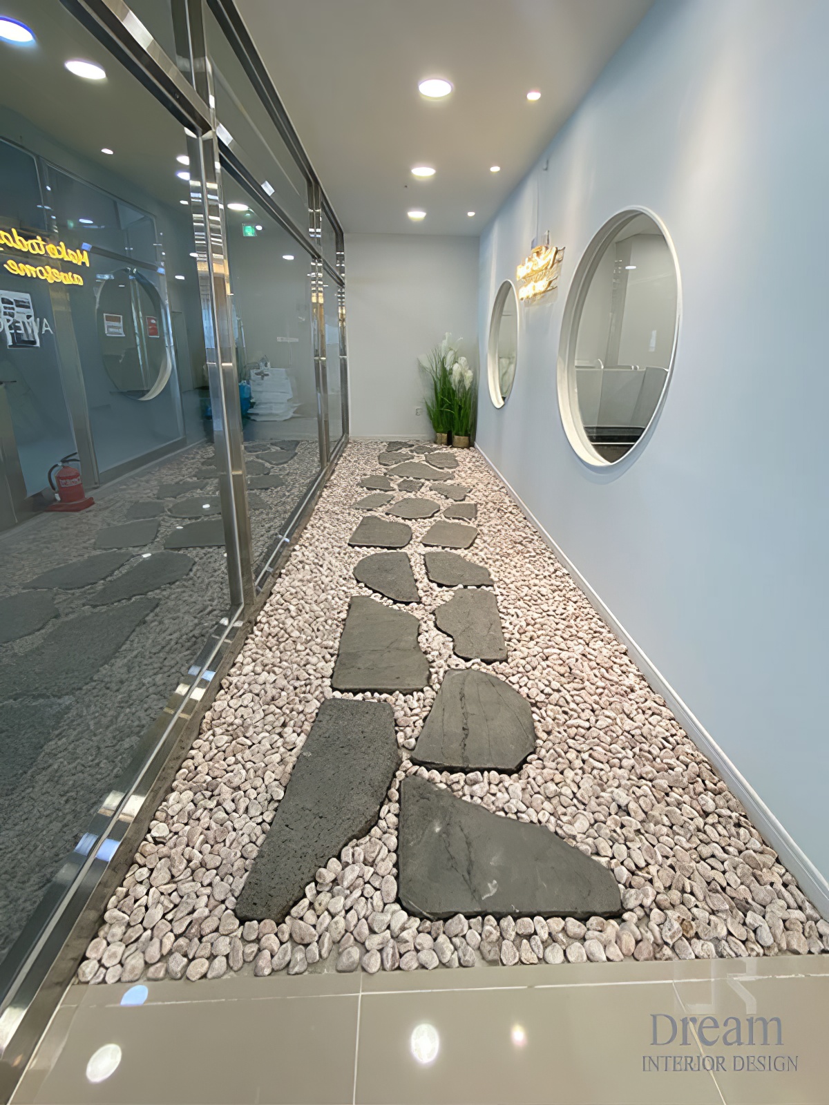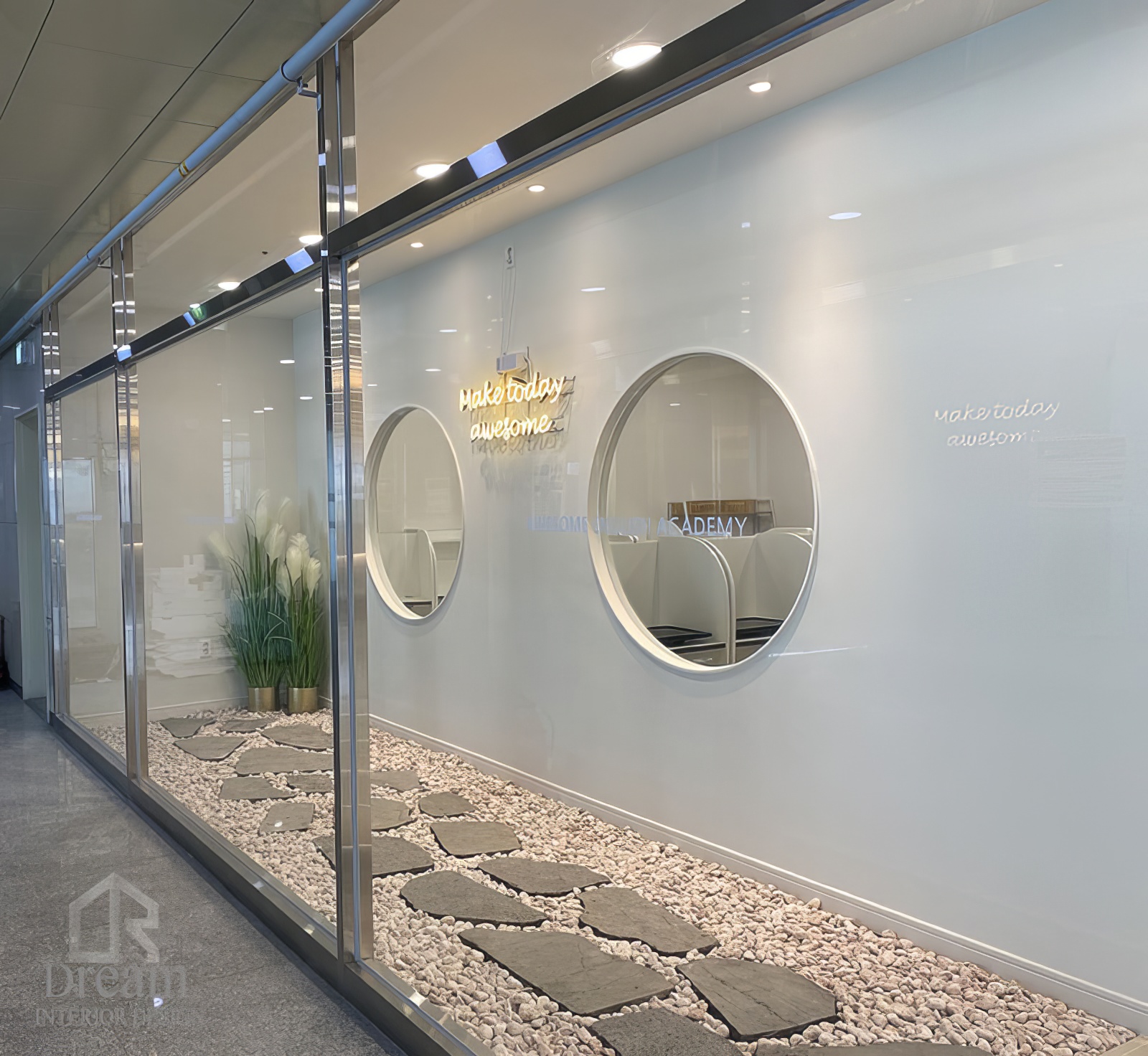 특징은 로비 한편에 징검 다리와 자갈과 조경 (조화) 화분이 색다른 포인트가 된 학원 입니다.