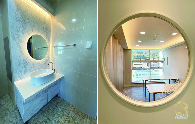 교무실은 격자 칼라 샷로 만들어 졌으며 내부에는 벽면 수납 테이블을 제작하여 탑볼 세면기를 설치 하였습니다.
