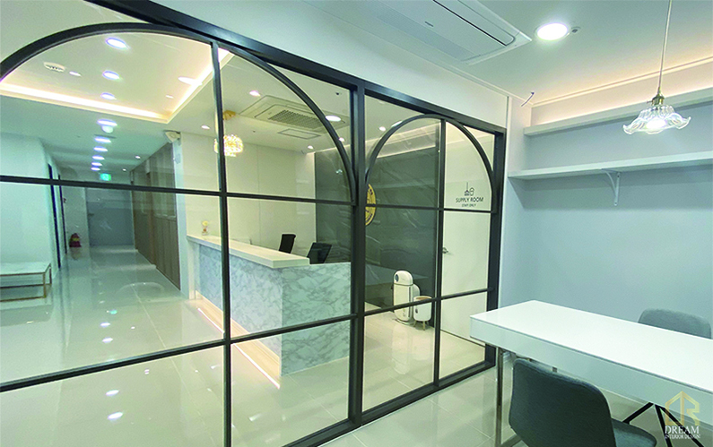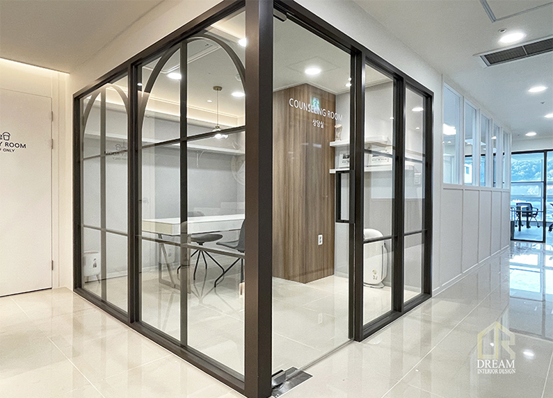 상담실은 칼라 샷시를 벤딩 처리하여 아치형으로 모양을 내었습니다.