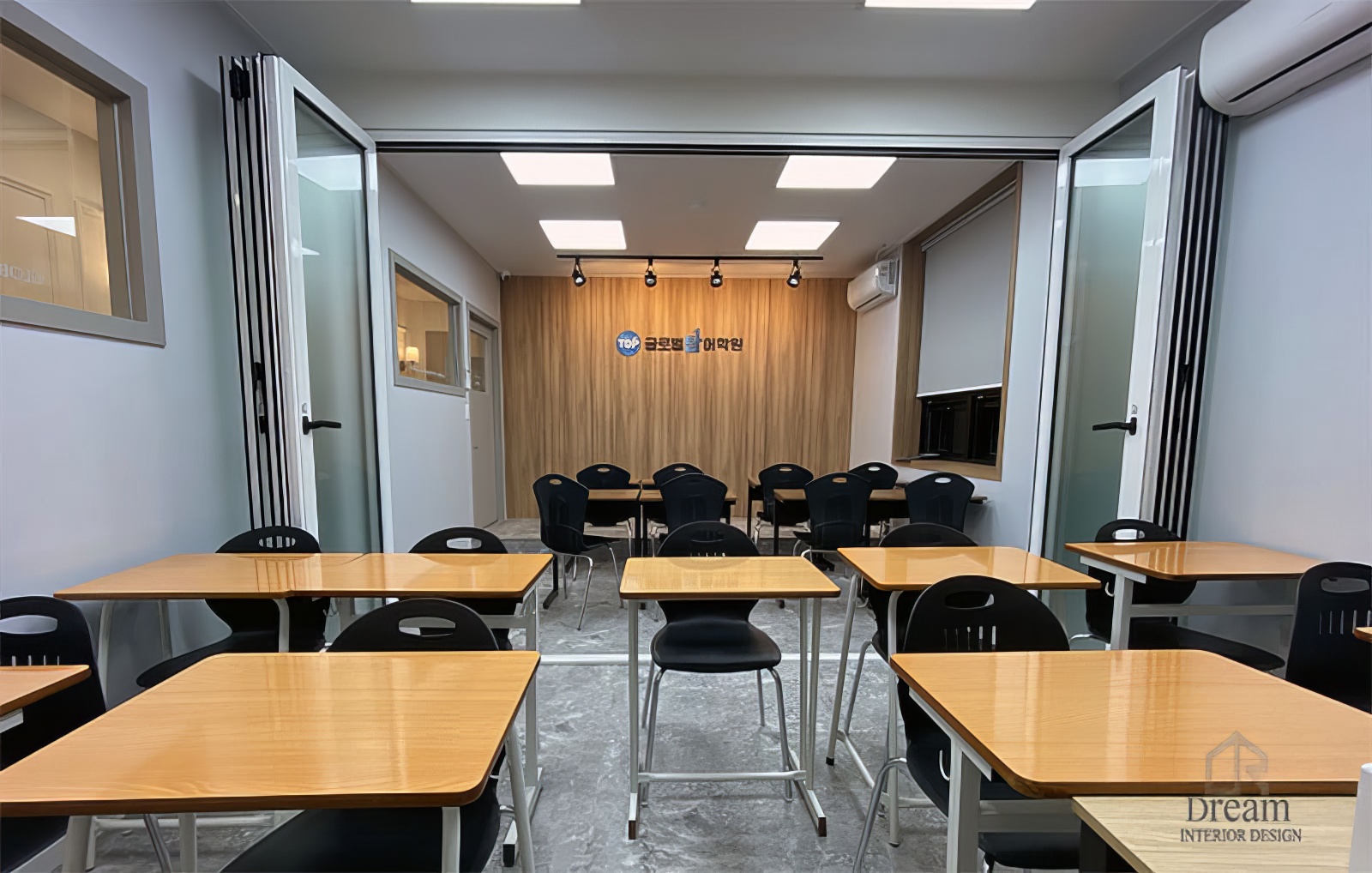 한쪽 교실에는 단상을 만들고 메인 벽에는 레일등과 우드 벽체를 만들어서 다용도로 사용 할수 있게 디자인 되었습니다.